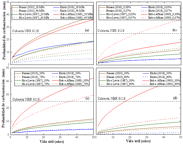 La Figura 2 (a) contiene los resultados del análisis de sensibilidad de los modelos con respecto a la resistencia a la compresión, considerando valores de 20 y 40 MPa en el proceso de carbonatación natural durante un período de 50 años. En esa figura se presentan las profundidades de carbonatación y el tiempo de VU, siendo indicada la cobertura mínima de 25 mm estipulada por la norma brasileña NBR 6118 (2014) para las estructuras en ambiente urbano (clase de agresividad II, moderada).