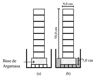 La base de los muros construidos tenía una altura aproximada de 50 milímetros, realizada en mortero armado, con una malla cuadrada galvanizada de 250 milímetros para evitar roturas por cizallamiento. Se insertaron barras de acero en la base del mortero, sirviendo como ganchos para manipular las muestras, como se representa en la Figura 2 (a). Después del proceso de curado de 21 días, los muros se construyeron sobre los cimientos. Las muestras estaban compuestas por 2.5 ladrillos por fila, en total 8 filas, con juntas verticales intercaladas como en mampostería real, como se muestra en la Figura 2 (b). La pared está en contacto con la humedad del suelo a través de los cimientos, hechos de materiales cementosos.