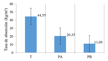 La tasa de absorción de agua se calculó por la diferencia entre la masa seca y húmeda, dividida por el área de contacto de los muros y el mortero base, de acuerdo con la Ecuación 2.