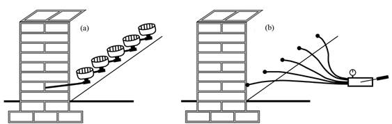 The application of chemical barriers by gravity feed or impregnation (Figure 1(a)) is based on the gravity force and the materials capillarity and can be performed by inserting the chemical products without complex apparatus (Torres, 2014). In accordance with most Brazilian manufacturers, the drilling must be performed at a 45° inclination and the holes should be saturated before the insertion of the products, promoting an improvement on the dispersal and consequently in the entire process (Socoloski, 2015). The application of the chemicals must be integral and continuous encompassing the entire treated area. The non-intrusive behavior in conjunction with the versatility of this technique results in a worldwide acknowledgment of its usage in historical buildings. However, in order to demonstrate its efficiency, some years can be required (Carrio, 1997). In the application by injection, as shown in Figure 1 (b), the fluid is pumped onto the wall by pressure, using an injection pump with special nozzles that prevent the products retraction. Several sets of mouthpieces can be attached simultaneously to the injection pump or the injection can be executed independently (Luso, 2002). The injection pressure is not necessarily constant and can vary from applicator to applicator, but it must not exceed 0.4 MPa. This range prevents the possible degradation on the constituent materials of the treated walls (Henriques, 1994).