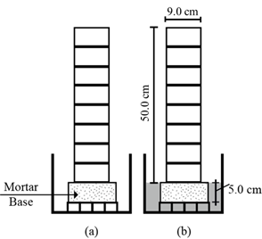 The base of the constructed walls had approximately 50 millimeters of height, executed in a reinforced mortar, with 250 millimeters galvanized square mesh for the prevention of shear rupture. Steel bars were inserted into the mortar base, serving as hooks for the handling of the specimens, as shown in Figure 2(a). After 21 days curing process, the walls were constructed onto the bases. The specimens were composed by 2.5 bricks per row, totaling 8 rows, with vertical joints interspersed as in a real masonry, as shown in Figure 2(b). The contact of the wall with soil moisture is given through the foundation, made of cementitious materials.