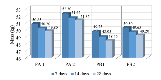 a) Mass measurement of all specimens (dry mass before treatment), 21 days after their execution.