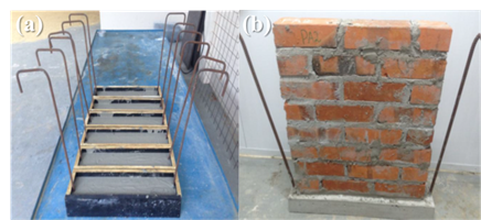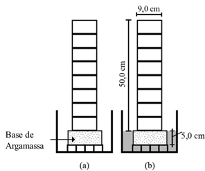A base das paredes construídas tinha aproximadamente 50 milímetros de altura, executada em argamassa armada, com tela quadrada galvanizada de 250 milímetros para a prevenção de ruptura por cisalhamento. Barras de aço foram inseridas na base da argamassa, servindo como ganchos para o manuseio dos corpos de prova, conforme mostrado na Figura 2 (a). Após o processo de cura de 21 dias, as paredes foram construídas sobre as bases. Os corpos-de-prova foram compostos por 2,5 tijolos por fileira, totalizando 8 fileiras, com juntas verticais intercaladas como em uma alvenaria real, conforme mostrado na Figura 2 (b). O contato da parede com a umidade do solo se dá através da fundação, feita de materiais cimentícios.