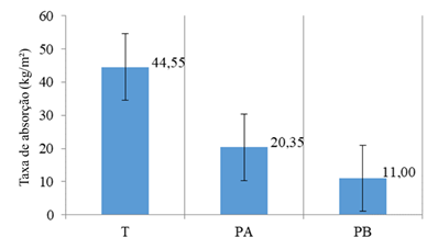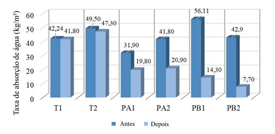 A massa de cada corpo de prova testado foi registrada para calcular a taxa de absorção antes e após o tratamento químico. Os resultados são apresentados na Tabela 3 e na Figura 5.