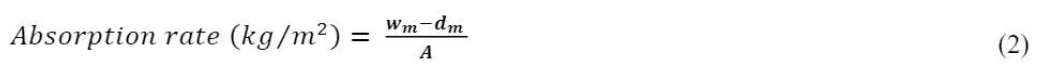A taxa de absorção de água foi calculada pela diferença entre a massa seca e úmida, dividida pela área de contato das paredes e da argamassa de base, conforme Equação 2.