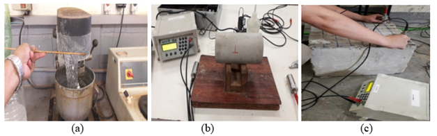 After the Slump tests, 12 cylindrical specimens (100 mm in diameter and 200 mm in length) and one prismatic specimen (400 x 400 x 300 mm³) were molded for each mixture simulating part of a finished diaphragm wall, totaling 48 cylindrical and four prismatic specimens. After 28 days, the cylindrical samples were ultrasound-tested by direct wave propagation method (Figure 1b) and prismatic samples by indirect method (Figure 1c), representing the in loco inspection.
