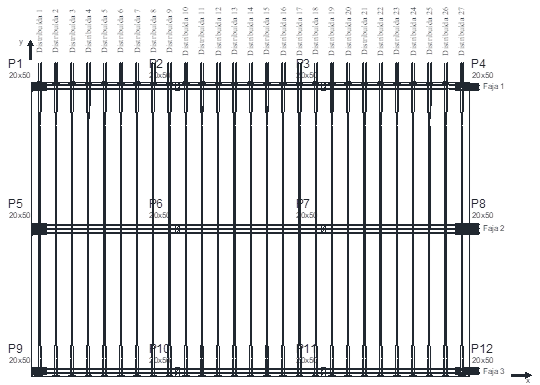El trazo de los cables de postensión siguió la premisa de disponer las fajas de tendones concentradas en la dimensión más grande de la losa (dirección x) y, tendones distribuidos en la dirección perpendicular (dirección y), Figura 3.