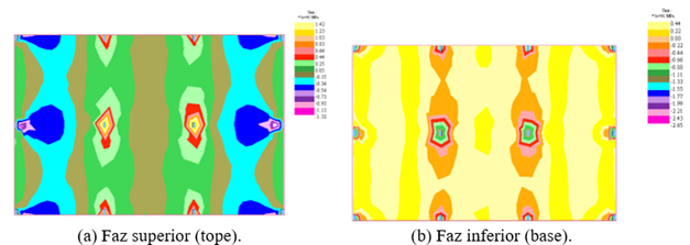 En la Figura 7 se presentan las tensiones normales en la dirección “x” para las faces superior e inferior de la losa, para la combinación frecuente, del Modelo M8.