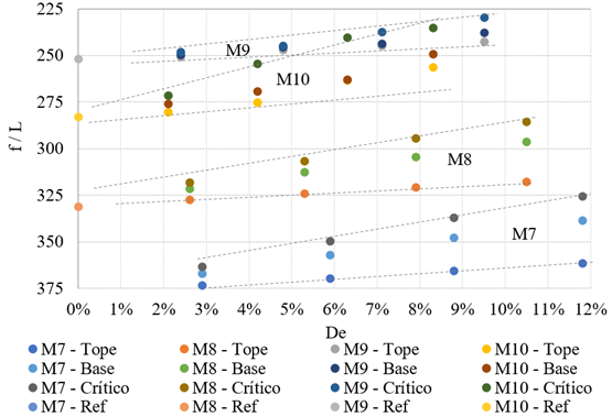 Para mejor comprensión de los efectos de la alteración de la excentricidad de los cables en el comportamiento a flexión de la losa, se desarrolló el gráfico de la Figura 8. En este gráfico en el eje de ordenadas, la relación f/L representa, en forma de denominador de fracción, la flecha equivalente, por ejemplo L/430, donde el valor L/250 es la flecha límite. En el eje de abscisas se sitúan las excentricidades relativas, o sea, el valor del desplazamiento dado al cable (excentricidad), en relación al espesor de la losa. La excentricidad relativa (o variación de excentricidad relativa) puede ser más o menos influyente para diferentes casos. Observando la alineación de los puntos, puede verse que para todos los modelos de losa la hipótesis crítica conduce a mayores variaciones en los desplazamientos. Se han insertado líneas discontinuas para demostrar los casos probados, M7 a M10.