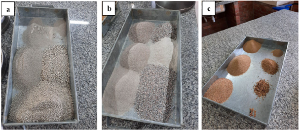 | Figura 1. Fracciones de partículas de polvo de mármol (a) polvo de piedra triturada granítica (b) agregado fino natural (c). | ||||