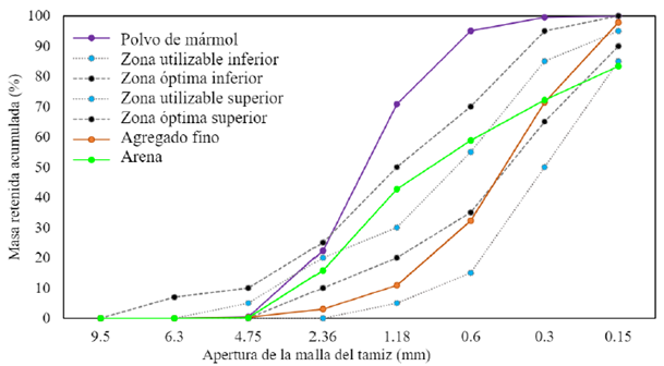 Varadharajan, Jaiswal y Verma (2020) analizaron la durabilidad y resistencia del concreto con 5%, 10%, 15% de polvo de mármol en lugar de agregado fino, además de una relación agua/cemento (a/c) de 0,43. El estudio reveló una mejora en la resistencia a la compresión de aproximadamente 35 MPa a los 28 días, es decir, un 15% mayor en comparación con los compuestos de referencia.