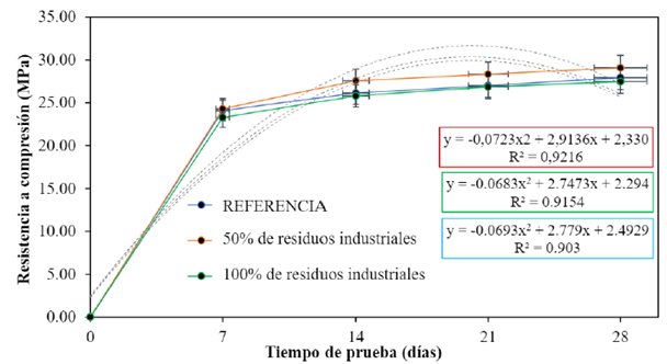 Los datos obtenidos en este estudio no corroboran los obtenidos por Rodrigues, Brito y Sardinha (2015), donde reportan una disminución en los resultados de la resistencia axial a compresión debido al aumento en el porcentaje de residuos de polvo de mármol. Los autores informaron una pérdida máxima del 31% a los 28 días de cicatrización.