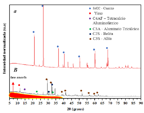 Difracción de rayos X de agregado fino natural (a) cemento Portland/aglomerante (b).