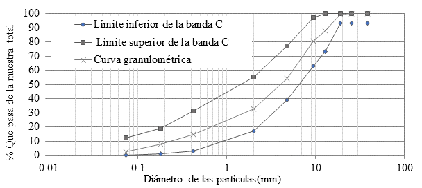 La figura 1 muestra la composición granulométrica de las mezclas asfálticas. La curva granulométrica consta de: (1) 21% de piedra triturada 3/4'', (2) 30% de piedra triturada 3/8'' e 49% de finos de trituración. Esta composición se utilizó para las cuatro mezclas asfálticas, y se obtuvo mediante un proceso de ensayo para que la curva granulométrica se ajustara a los límites de la banda C especificados en la norma DNIT ES 031/2006.
