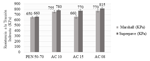 La figura 3 muestra los resultados del ensayo de resistencia a la tracción indirecta para los métodos Marshall y Superpave.