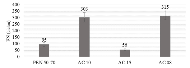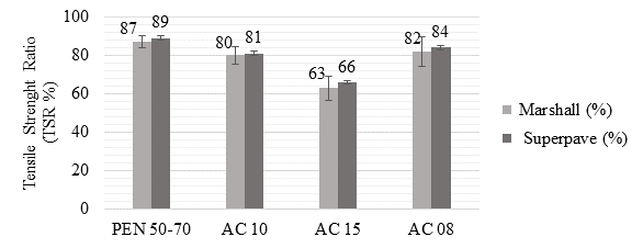 La mezcla con el ligante PEN 50-70 cumple con una resistencia a la tracción mínima de 650 kPa (conforme a la norma DNIT ES 031/2006), tanto para el método Marshall como para el Superpave. Para las mezclas asfalto caucho, la norma DNIT ES 112/2009 requiere una resistencia a la tracción mínima de 750 kPa. Este límite fue cumplido por todas las mezclas, excepto por la mezcla AC15 compactada por el método Marshall.