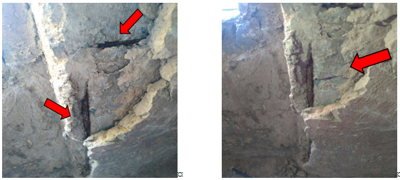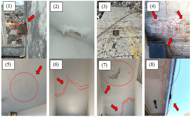 Já na família de Lajes, os elementos L01 a L08 foram identificados, conforme a figura 2, e neles destaca-se a constante presença de umidade gerando manchas escuras no elemento L01, detacamento da pintura no elemento L02, formação de estalactites de carbonato de cálcio, devido a eflorescência no elemento L04, pequenas manchas e fisuras nos elementos L05 e L08 e desgaste da impermeabilização no elemento L03. Também nota-se fisuras nos elementos L06 e L07 devido a carregamentos adicionais aplicados por uma antena de telefonia sobre a cobertura.