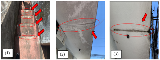 Manchas de eflorescencia nos reservatório. (1) Desgaste dos degraus da escada no elemento E01. (2) e (3) Manchas debido a umidade nos elemento J01 e J02.