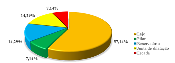 Primeiramente, observou-se que a família que possui a maior quantidade de elementos que apresentam manifestações patológicas trata-se da família de lajes, com 57,14% das anomalias identificadas, como é possível observar na figura 5.