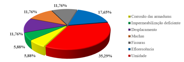 Através do mapeamento das manifestações patológicas que acometem o edifício, notou-se que nos 14 elementos estruturais vistoriados, 35,29% das manifestações patológicas são originadas devido a infiltração de umidade como é possível observar na figura 6. Além disso, outras manifestações patológicas como a eflorescência (17,65%) e as manchas escuras (11,76%) também possuem causa semelhante.