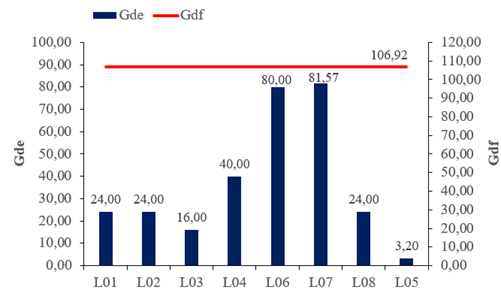 Em relação a metodologia GDE/UnB (2007) é possível levantar algumas análises com base no modelo de gráfico utilizado por Medeiros et al. (2020). Na família de lajes, o elemento L06 e L07 são os que mais apresentam influência para o cálculo do grau de deterioração da família, como é possível observar na figura 7. Além disso, vale destacar que o elemento L05 não é levado em consideração para o cálculo do Gdf por apresentar Gde menor que 15.