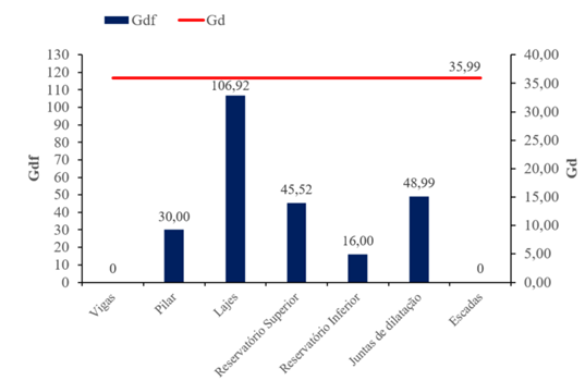 Dessa forma, ao avaliar o grau de deterioração das famílias e o grau de deterioração da estrutura, nota-se que as lajes são as que representam maior influência para que a estrutura esteja em um nível deterioração médio,15 a 50, e por isso necessita de uma intervenção dentro de um prazo máximo de 2 (dois) anos. A figura 12, mostra os valores de Gdf de cada família em comparação ao valor global da estrutura, Gd.