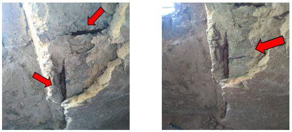 En la familia de columnas, sólo se identificó un elemento, el P01, y se pudo constatar una gran exposición de la armadura en el proceso de corrosión, identificándose manchas a lo largo de la armadura y desconchados del hormigón debido a la expansión de la armadura, como se puede observar en la Figura 1.