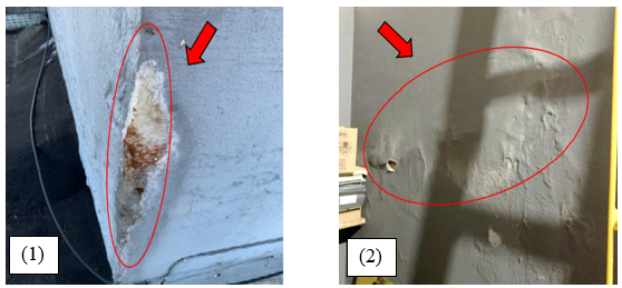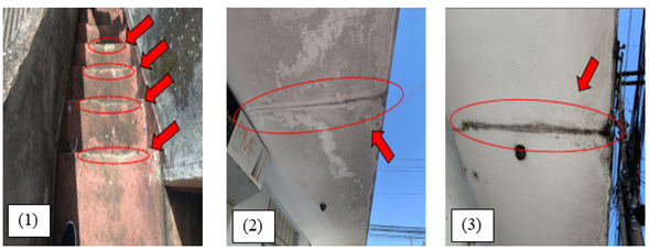 Manchas de eflorescencia en los depósitos. (1) Desgaste de los peldaños de la escalera en el elemento E01. (2) y (3) Manchas debidas a la humedad en los elementos J01 y J02.