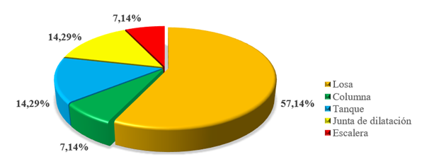 En primer lugar, se observó que la familia con mayor número de elementos que presentan manifestaciones patológicas es la familia de losa, con el 57,14% de las anomalías identificadas, como se puede observar en la Figura 5.