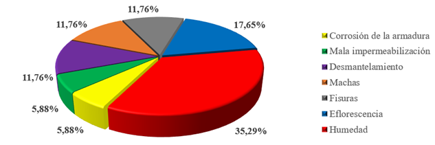 Del análisis de los resultados, se observó que la mayoría de las manifestaciones patológicas que se producen en la estructura del edificio están asociadas a la humedad en cierto grado, ya sea originando eflorescencias, manchas o infiltraciones. De esta forma, se muestra como un factor recurrente que debe ser resuelto porque puede comprometer las condiciones de seguridad y salud de los propietarios.