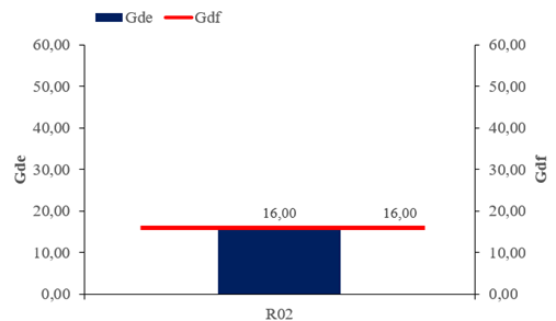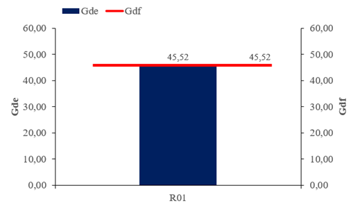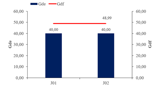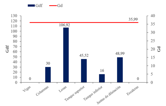 Además, en las juntas de dilatación se encontró la presencia de dos elementos que presentan el mismo grado de deterioro, pero el grado de deterioro de la familia es mayor que el valor obtenido para los elementos individuales. Así, por las formulaciones matemáticas se puede observar que la influencia de la repetición de elementos que tienen el mismo grado de deterioro no representa un incremento tan significativo, ya que tiene como referencia el valor máximo, siendo este valor multiplicado por el resultado de la raíz que implica la suma y el valor máximo. La figura 11 muestra el valor de Gdf y los valores de Gde para cada elemento.