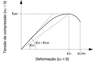 Quando comprimido, o concreto apresenta um comportamento elástico até atingir o seu valor médio de resistência à compressão (f cm ), passando a perder rigidez. A partir deste ponto, o desenvolvimento de microfissuras causa o amolecimento do material, representado no trecho decrescente do diagrama.