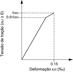 O concreto tracionado apresenta um comportamento elástico linear até atingir a deformação de tração do concreto (ε ct ) de 0,15‰. Em aproximadamente 90% do valor médio da resistência à tração axial do concreto (f ctm ), o desenvolvimento de microfissuras causa a diminuição da rigidez do material, caracterizando uma zona de fissuração. Em tensões próximas ao f ctm o quadro se intensifica, uma vez que ocorre a evolução das fissuras. A partir desse ponto, o material sofre uma redução drástica em sua rigidez.