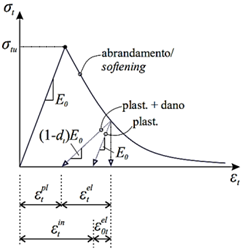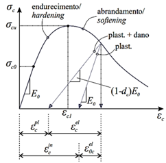 Para este modelo de material, o comportamento na presença do dano se encontra representado nos diagramas da Figura 5 e Figura 6 e é matematicamente descrito pelas leis tensão x deformação indicadas na Equação (18), para a compressão, e Equação (19), para a tração, propostas por Hibbitt et. al. (2011).