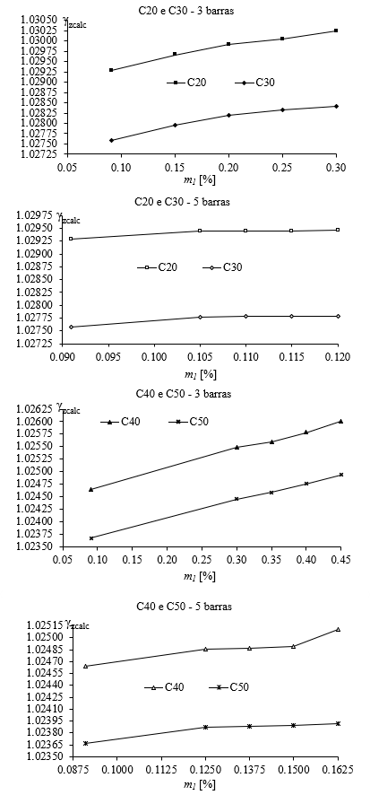 O f cm foi definido por meio da Equação (2), a partir do valor característico da resistência à compressão do concreto (f ck ) e do valor padronizado que representa a diferença entre a resistência média do concreto e a sua resistência característica (∆ f ).