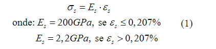 As tensões no aço (σ s ) foram obtidas por meio da Equação (1), com os valores do módulo de elasticidade do aço (E s ) e da deformação do aço (ε s ).