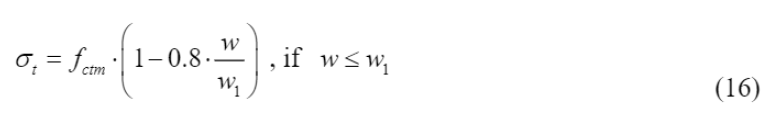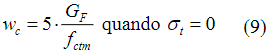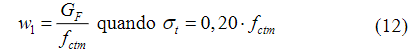 Na zona de fratura as tensões e deformações estão relacionadas a uma abertura de fissuras fictícia (w), sendo seus valores em pontos específicos, (w 1 ) e (w c ), obtidos por meio da Equação (10) e Equação (11), respectivamente. Finalmente, a energia de fratura (G F ) foi obtida por meio da Equação (12).