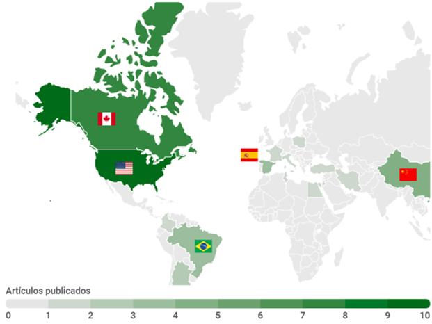 El mapa de la Figura 1 muestra que los países que más publicaron sobre el tema fueron: Estados Unidos con 10 artículos publicados, Canadá con 7 artículos, China con 4 artículos y España y Brasil con 3 artículos cada uno. Todos los demás países que están representados en un tono más claro de verde contribuyeron con una publicación cada uno. Con estos resultados, se puede observar un predominio de los países del hemisferio norte en la publicación sobre el tema, estando presente en el 43% de las publicaciones. A pesar de esto, se puede apreciar que este es un tema que se está estudiando en todo el mundo, con la participación de 16 países diferentes en los artículos encontrados.