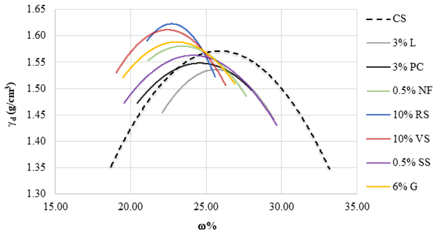 All the trials proposed in this document were executed in triplicate. The tests were fulfilled first with the control samples of the original soil, and later with the mixtures of clays and different stabilizers. Table 1 shows the stabilizers employed for this research, as well as the percentage by weight utilized for the mixtures.