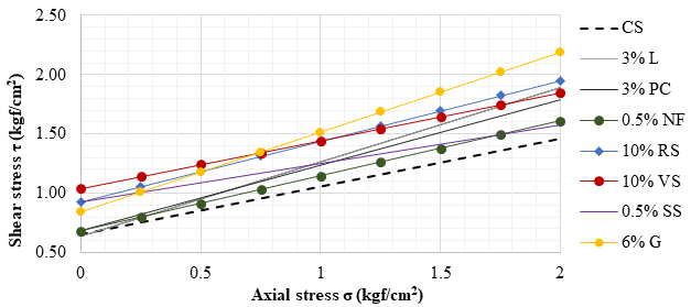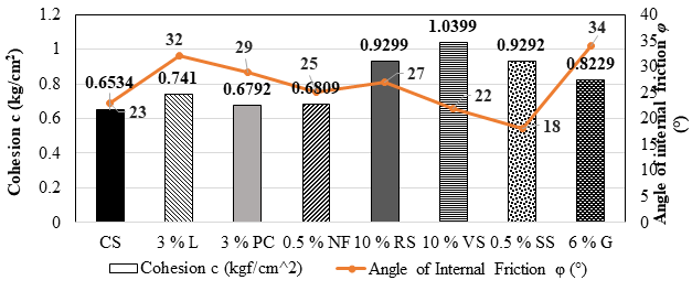 Cohesion (c) and internal friction angle (() values of the original sample and the mixtures with stabilizers.