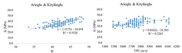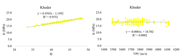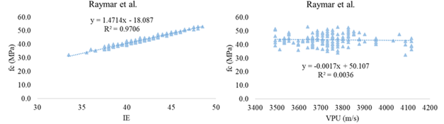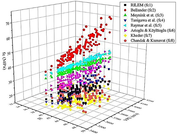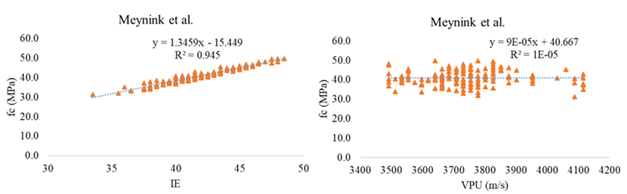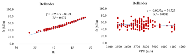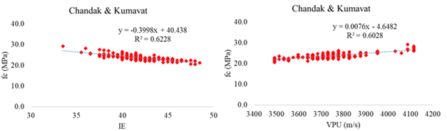 Para determinar la relación de estas variables sobre la fc, los resultados se correlacionaron de forma independiente combinando el IE y la VPU obtenidos con el fc calculado. Los resultados se muestran en las Figuras 4, 5, 6, 7, 8, 9, 10, 11. Para la construcción de las gráficas se organizaron los datos a partir del procesamiento estadístico, de manera que todos los modelos cuentan con la misma población de datos. El análisis del comportamiento de las variables IE y VPU con respecto a la fc calculada muestra que en los modelos donde existe una correlación coherente para ambos pares de variables (IE vs fc, VPU vs fc) (Figuras 6, 9), la fc calculada tiende a acercarse más al valor de referencia. Para los casos de los modelos propuestos por Bellander, Meynink et al., Raymar et al. y Kheder (Figuras 7, 8, 10, 12 respectivamente), si bien muestran una muy buena correlación entre el IE vs fc, con respecto a la VPU no parece haber influencia de esta variable sobre el fc, por lo que el resultado obtenido difiere mucho del valor de referencia de 27,0 MPa. Quizás esta sea la razón por la que las diferencias con respecto a la referencia fueron superiores al 20% para todos los casos. Un resultado interesante se obtuvo del modelo de Chandak & Kumavat (Figura 13), donde las relaciones IE y VPU son opuestas con respecto a la fc. Que el error obtenido sea inferior al 15% puede estar asociado a que, si bien las correlaciones son contrarias, existe una tendencia lineal del IE y la VPU sobre la fc calculada.