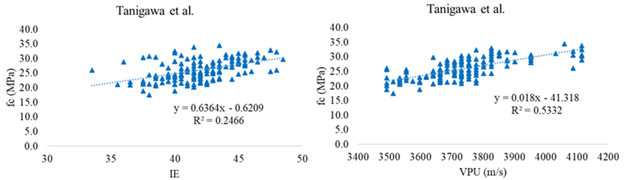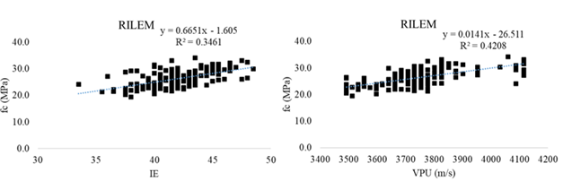 Los resultados se exponen en la tabla 8. En el cálculo de la fc de los modelos propuestos (Tabla 9), se observa mayor dispersión en los CV de los resultados, lo cual se debe al diseño propio de cada ecuación. Basado en los resultados obtenidos, los modelos con mejor aproximación al valor de referencia son RILEM y Tanigawa et al. con 26.29 MPa and 26.07 MPa respectivamente (Figura 3), con un error inferior al 4% para ambos casos (Figura 4). En la figura 5 se observa como algunos modelos presentan un comportamiento lineal, mientras otros reflejan una mayor dispersión en los resultados. Esta variabilidad está determinada por el diseño propio de cada ecuación (lineal, polinomial y de potencia) para la estimación de la fc, la cual es dependiente de los valores de IE y VPU obtenidos.