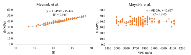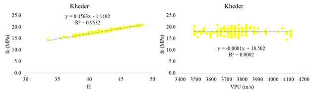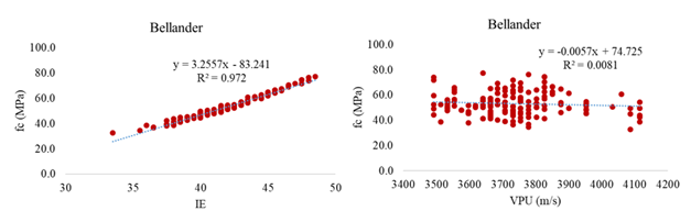 The quality of concrete is generally expressed in terms of resistance since buildings must be designed to support different types of loads. Concrete is a material that is made up of cement, fine and coarse aggregates, water, and additives, and once it sets it is necessary to know the resistance value acquired, mainly after 28 days. For this purpose, numerous calculation equations have been developed that allow estimating the concrete's fc from the values of the Rebound Hammer (RN) (Lima and Silva, 2000), ultrasonic pulse velocity (UPV) (Hannachi and Guetteche, 2012, Popovics, 1991) or the measurement of the apparent resistivity (ρ) of the concrete (Araújo and Meira, 2021).
