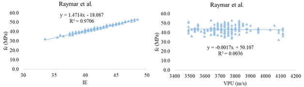 To determine the relationship of these variables on the fc, the results were independently correlated by combining the RN and the UPV obtained with the calculated fc. The results are shown in Figures 4, 5, 6, 7, 8, 9, 10, 11. For the construction of the graphs, the data was organized from the statistical processing, so that all the models have the same population of data.