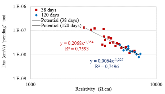 Figure 10 presents the relationship between the surface electrical resistivity and the mass transport considering the different concrete mixtures of this work. This relationship can be expressed by Equation (2). According to Andrade, et al. (2014), chloride resistivity and diffusivity relations cab be obtained in a quick manner using the resistivity measurements and Equation (2), where Dns represents the apparent diffusion coefficient, K is a constant which depends on the concentration of solution used, is the apparent resistivity of the concrete and a is an exponent which depends of the chloride binding capacity of the matrix.