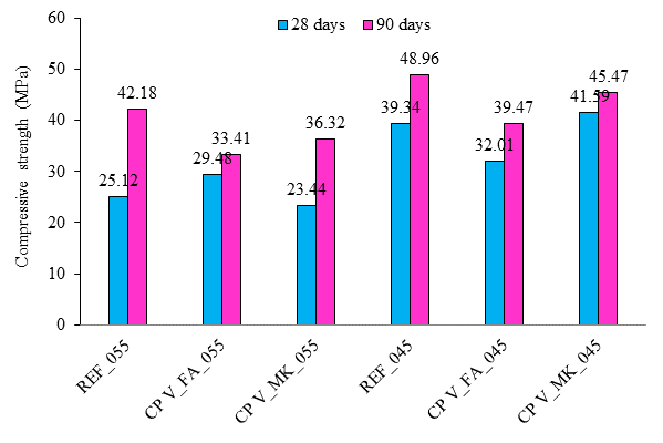 Other researchers such as Cheng et al., (2017), Liu et al., (2014) and Liu et al., (2016) obtained similar results, with reduction of 23% and 15% for concretes with 15% cement replacement by fly ash, in mass, and for 0.47 w/b. Figueiredo et al. (2014), by investigating the contribution of MK against the chloride effect, obtained reductions of 7% in the 90 day compressive strength with 10% replacement of cement by metakaolin and 0.60 w/b.