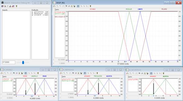 Una verificación del sistema diseñado se inicia invocando un modo de depuración del software fuzzyTECH. Todos los cambios realizados en el controlador se implementan inmediatamente en la tarea del controlador depurado actual, esto permite la prueba de los cambios ingresados en el controlador debido a datos de entrada específicos, esto es, verificar el comportamiento del sistema con datos ingresados manualmente. Se recorre por completo el rango de 0 cm a 70 cm, en la Figura 3 se observa el caso cuando se alimenta la entrada con un valor de 37cm que es alimentado manualmente y el valor que correspondería a las salidas.