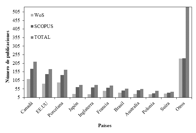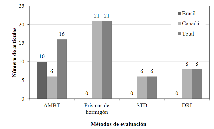 Se encontró un total de 727 registros sobre RAA en la base de datos de WoS, siendo 113 de estas publicaciones canadienses y 33 brasileñas. En la base de datos Scopus se obtuvieron 1096 registros, donde Canadá aportó con 173 publicaciones y Brasil con 46. En general, con base en la información obtenida, parece que Canadá es el país que más aporta a los estudios relacionados con RAA, representando cerca del 22% del total, mientras que Brasil representa el 5,7%. Así, el número de estudios publicados sobre " Alkali-aggregate reaction" en Canadá es casi cuatro veces mayor que en Brasil.