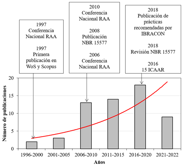 Los temas desarrollados por investigadores brasileños tratan sobre la investigación de las características de los materiales que influyen en el desarrollo de RAA (Tiecher et al., 2012; Tiecher et al., 2017), así como la caracterización del gel producido por RAA (Johnson et al., 2017), la investigación de obras con índicios de AAR (Hasparyk et al., 2009; Prado et al., 2019) y el análisis del comportamiento de nuevos materiales sometidos a RAA (de Carvalho et al., 2009 ).