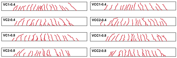 The final cracking pattern of tested beams are presented in Figure 2. The final cracking pattern of control beams and beams with corrosion was similar. This cracking pattern was defined by the formation of vertical flexural cracks at the beam center and diagonal flexure-shear cracks at beams ends.
